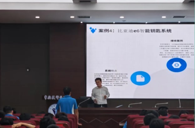 培训活动中,两位专家聚焦行业前沿技术,突出实战特色,为学生带来了一场生动的现场培训。宋红建围绕“新能源汽车故障排除与维修案例实战”,结合典型故障案例,深入剖析诊断流程与维修方法,并阐述了新能源汽车在“双碳”目标下的战略意义。黄建清则以“智能钥匙系统技术解析与维修实战”为主题,从技术原理到实战案例,全面解析智能钥匙系统的维修策略,并展望了生物识别、车联网融合等未来发展趋势。